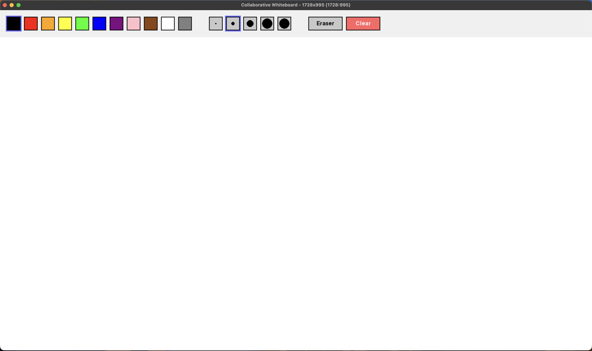 This collaborative project from my Network Programming class is a real-time whiteboard application that allows users to draw together on a shared canvas with different colors, stroke sizes, and other features. A central server is set up to receive point stroke data from clients and update it for other connected users. This project strengthened my understanding of computer networking and user interface design.